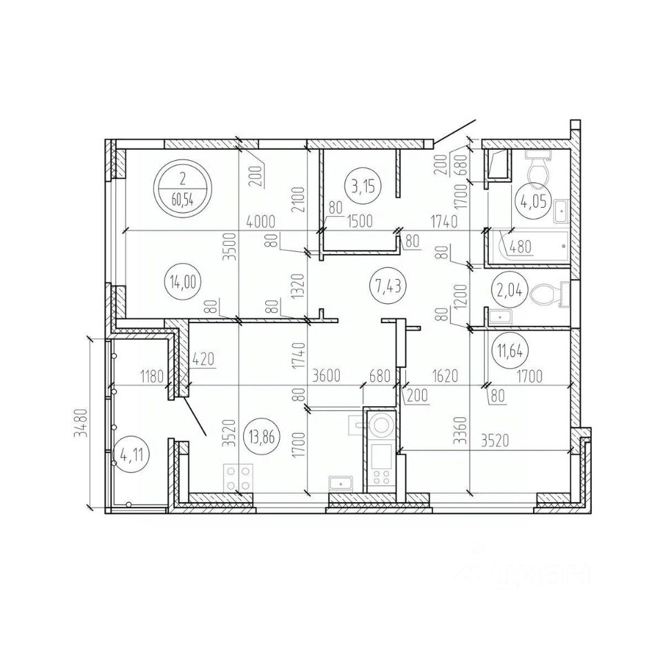 Общая площадь60,54 м²