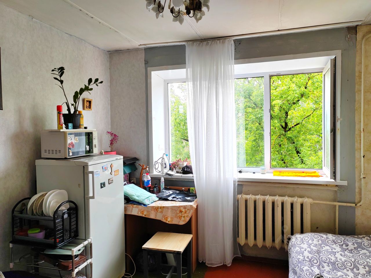 **Остается мебель и техника:** холодильник, микроволновка, кровать, шкаф, стол, стул.