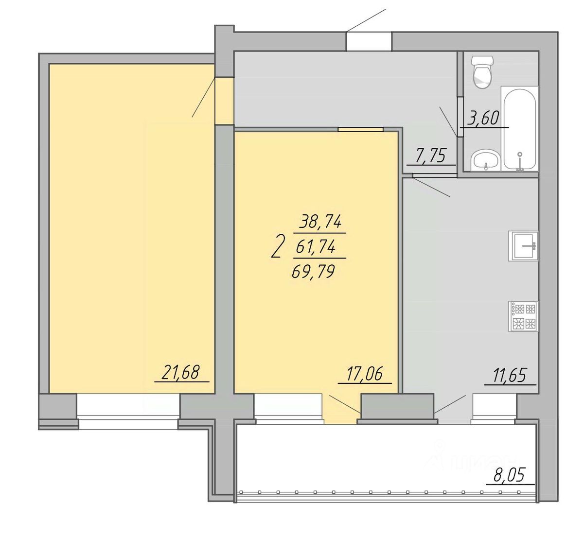 2-комн. квартира, 69,79 м²