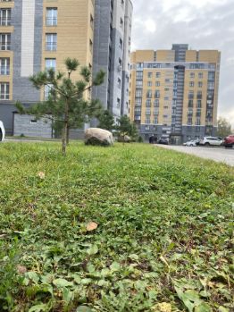 Во дворе много зелени, есть место для парковки и детская площадка.