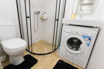 Ванная: душевая кабина, стиральная машинка, зеркало.