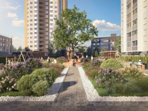 Жилые дома образуют квартал, оборудованный детскими и спортивными площадками.