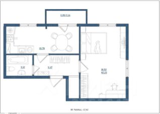 Просторная квартира, в новoм доме. Дом сдан! С ОТДЕЛКОЙ - ПОД КЛЮЧ!!! Общая площадь 42,83 кв.м. Комната 18,52 кв.м, кухня гостиная 10,78 кв.м. Есть кладовка.