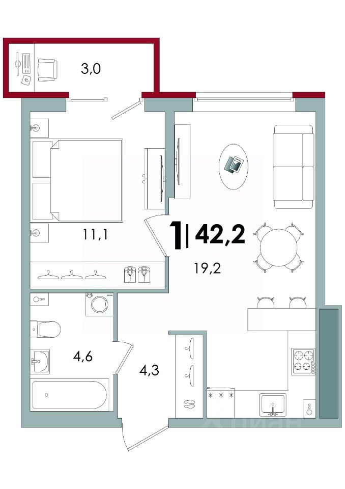 Общая площадь42,2 м²
