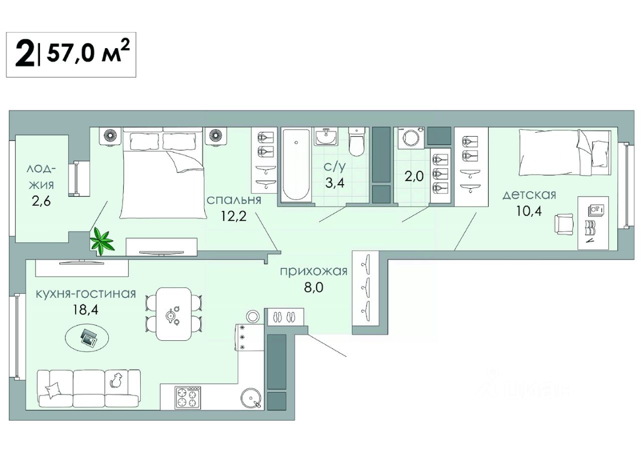 Продается 2-комн. квартира, 57 м²