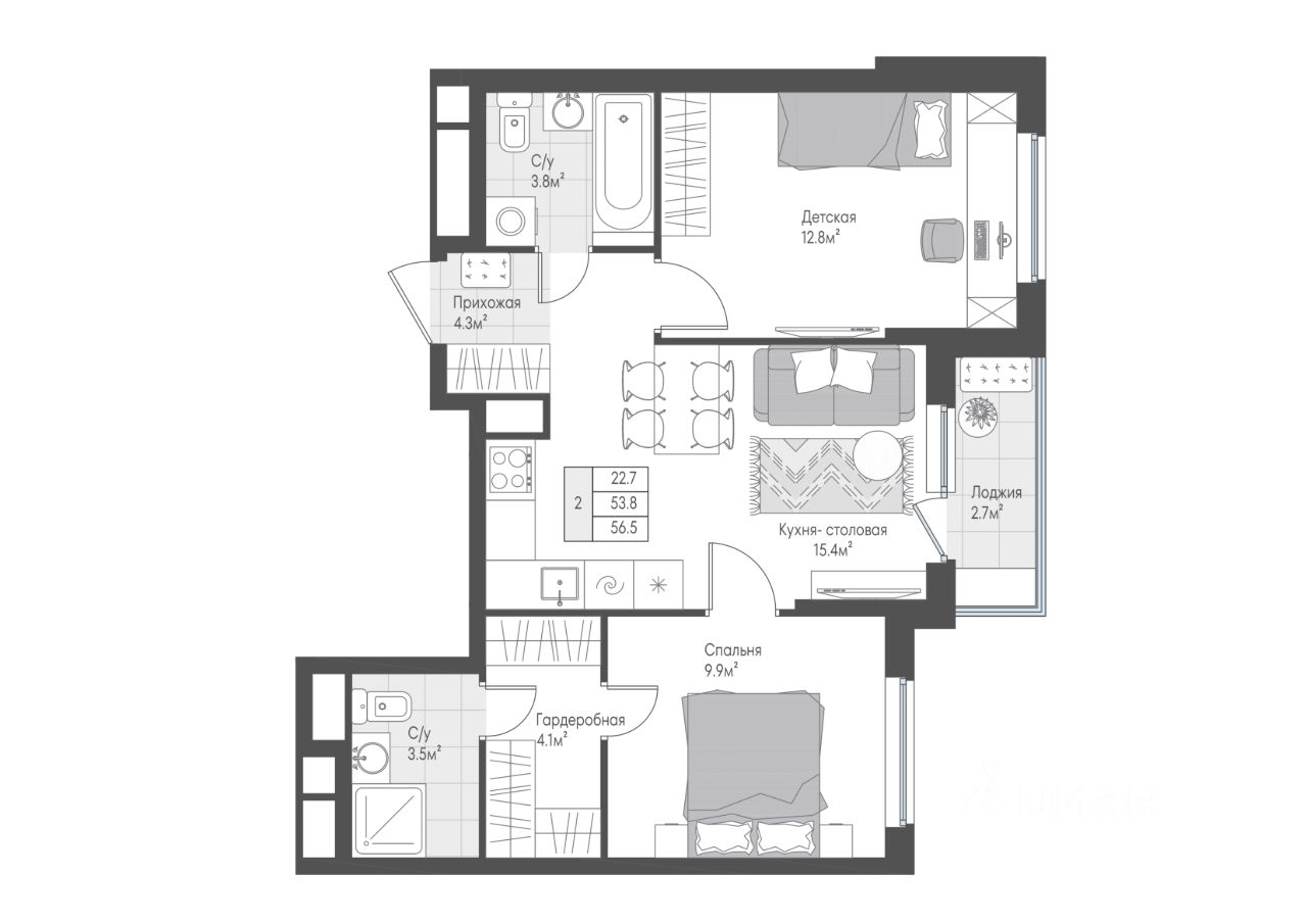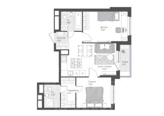 Продается квартира с кухней-гостиной и двумя спальнями по разные стороны от гостиной. Мастер-спальня с собственными гардеробной и санузлом. Лоджия с выходом из кухни-гостиной. Окна выходят во двор, что позволит наблюдать за прогулкой детей во дворе.