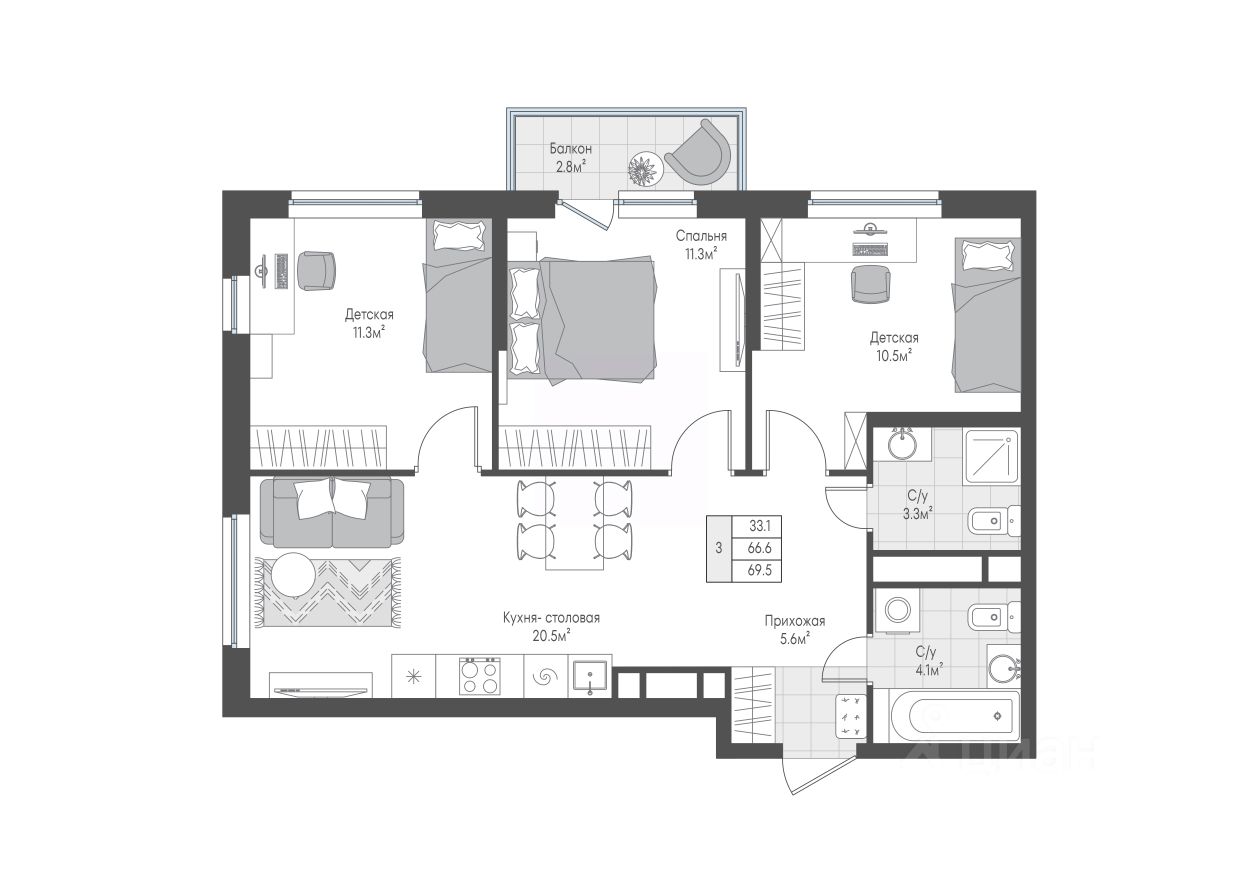 Станьте обладателем квартиры с просторной кухней-гостиной (20,5 кв м) и тремя изолированными комнатами. Два полноценных санузла для удобства всех членов семьи. Одна из спален имеет два окна, выходящие на разные стороны света.