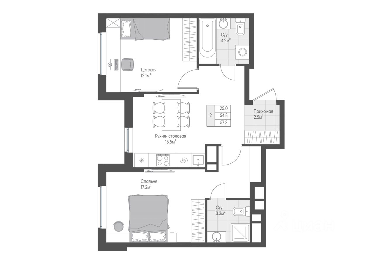 Продается квартира с кухней-гостиной и двумя спальнями по разные стороны и двумя полноценными санузлами для удобства всех членов семьи.