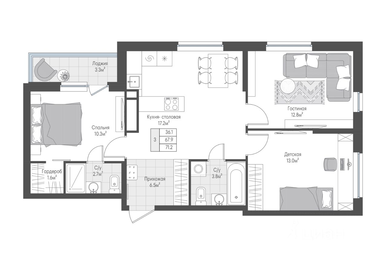 Станьте обладателем Квартира для большой семьи с кухней-гостиной и тремя изолированными комнатами. Для родителей есть современная мастер-спальня с собственным санузлом, гардеробной и выходом на лоджию. Две детские имеют правильную геометрическую форму, что позволяет расставить необходимую мебель.