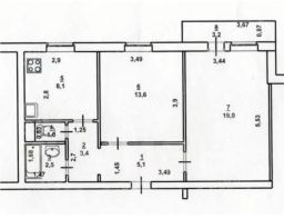 Просторная площадь: Общая 49,7 кв.м., изолированные комнаты 13,6 и 19,0 кв.м., кухня 8,1 кв.м.