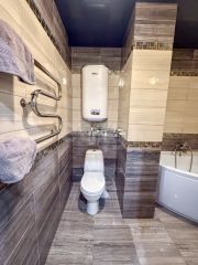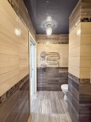 — Санузел: тёмная глянцевая плитка, точечное освещение, атмосфера как в отеле