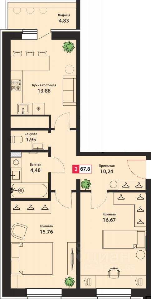 Продаётся 2-комнатная квартира в сданном доме (Оснабрюкская улица, 22к1), срок сдачи: III-кв. 2024, общей площадью 67.8 кв.м., на 21 этаже.