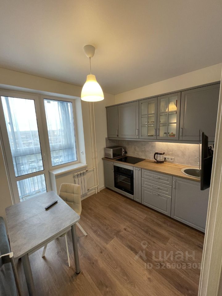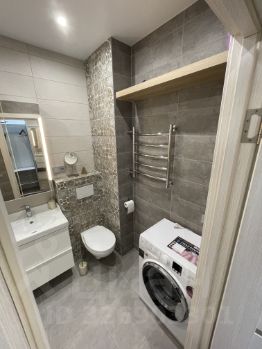 Кухня площадью 8.8 кв. м оснащена всей необходимой техникой и раскладной мебелью. Санузел совмещенный, выполнен в современном стиле, оборудованный подвесным унитазом. Также имеется лоджия панорамного остекления, где можно приятно провести время.