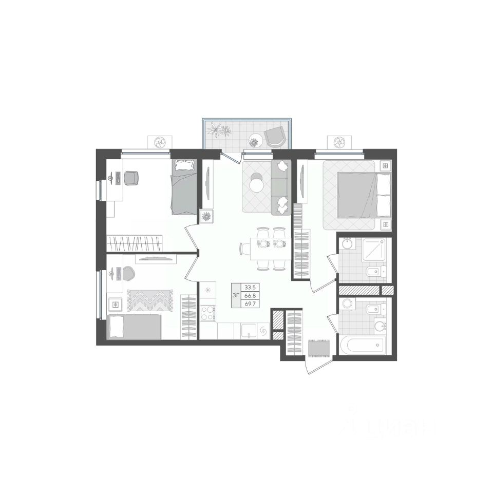 Станьте обладателем квартиры с просторной кухней-гостиной (20,5 кв м) и тремя изолированными комнатами. Два полноценных санузла для удобства всех членов семьи. Одна из спален имеет два окна, выходящие на разные стороны света.