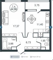 Продается однокомнатная квартира площадью 44,86 кв. м в новом ЖК БОТАНИКА Московский район. Расположена на 10 этаже 16-этажного дома. Высота потолков — 2,7 метра. Жилая площадь составляет 17,37 кв. м, а кухня — 11,4 кв. м. Окна выходят во двор, поэтому всегда будет тихо и спокойно.