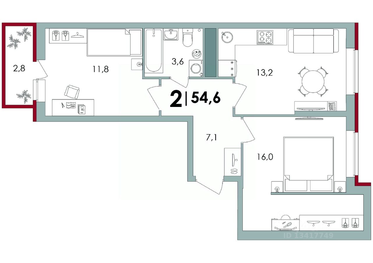 Общая площадь54,55 м²