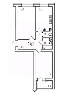 О квартире: Общая площадь 57.4кв.м., жилая 29.7кв.м., кухня 12.1кв.м.