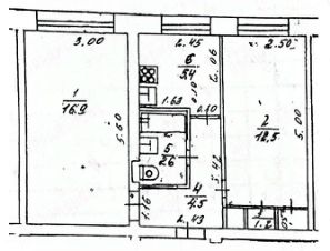 Общая площадь 43,1 кв.м., две просторные раздельные комнаты: 16,9 + 12,5 кв.м.