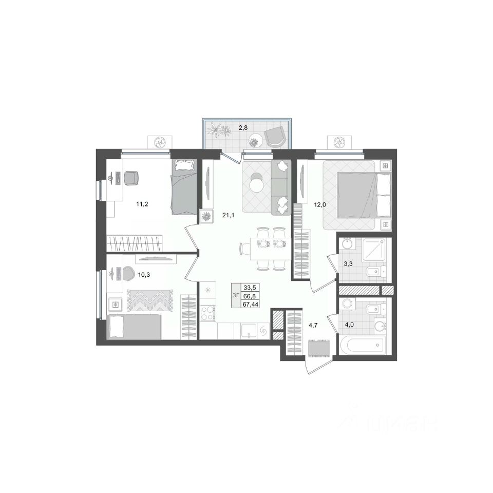 Станьте обладателем квартиры с просторной кухней-гостиной (20,5 кв м) и тремя изолированными комнатами. Два полноценных санузла для удобства всех членов семьи. Одна из спален имеет два окна, выходящие на разные стороны света.