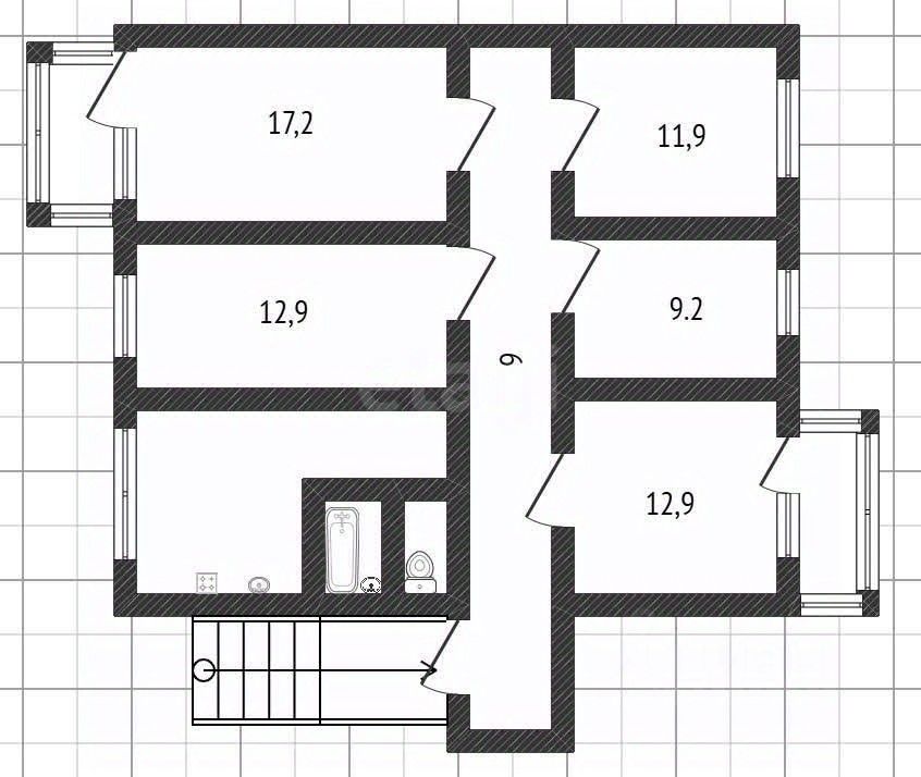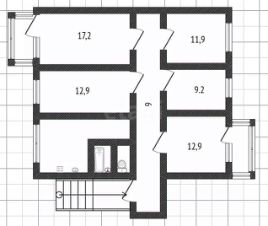 Планировка функциональна — все пять комнат изолированы, с площадями 9,2, 11,9, 12,9, 12,9 и 17,2 кв.м, что предоставляет широкие возможности как для комфортного проживания большой семьи, так и для инвестиций с последующей сдачей комнат или всей площади.
