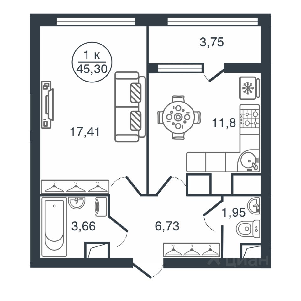 Общая площадь45,3 м²