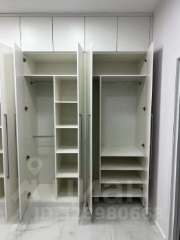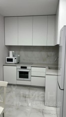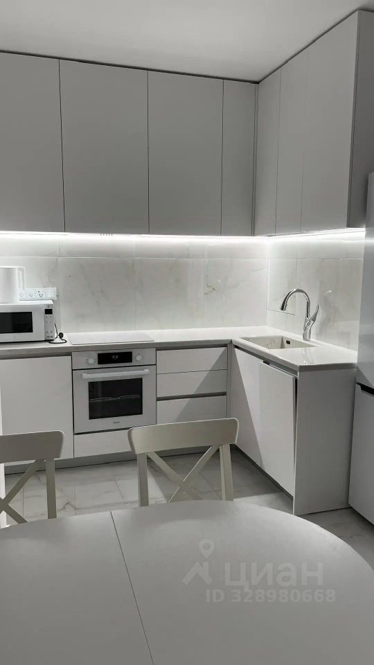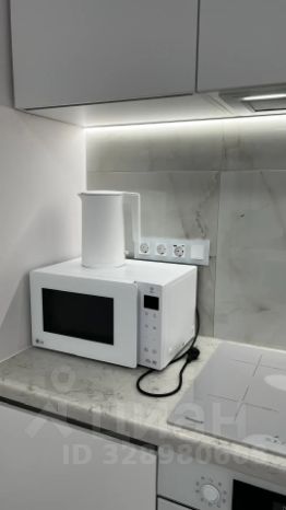 На кухне столешница выполнена из кварцевого камня, интегрированная мойка, смеситель для кухни Jacob Delafon с гибким изливом и функцией душа. Кухонная бытовая техника бренда Weissgauff (вытяжка, индукционная варочная панель, электрический духовой шкаф, посудомоечная машина 450 мм). Микроволновая печь LG, электрический чайник Xiaomi.