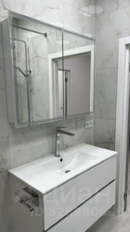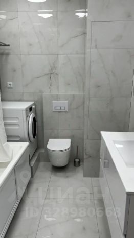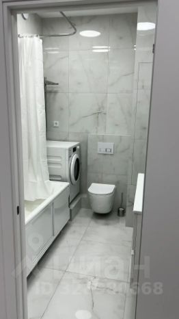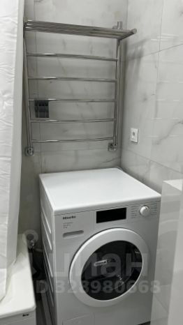 В ванной подвесной шкаф со встроенной раковиной, зеркальный шкаф с подсветкой, полотенцесушитель, стирально-сушильная машина Miele. Установлен водонагреватель. Ванна 170*70.