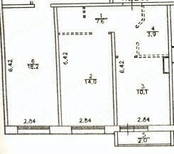 Общая площадь 37,6 м, комната 14 м, кухня 10,1 м.