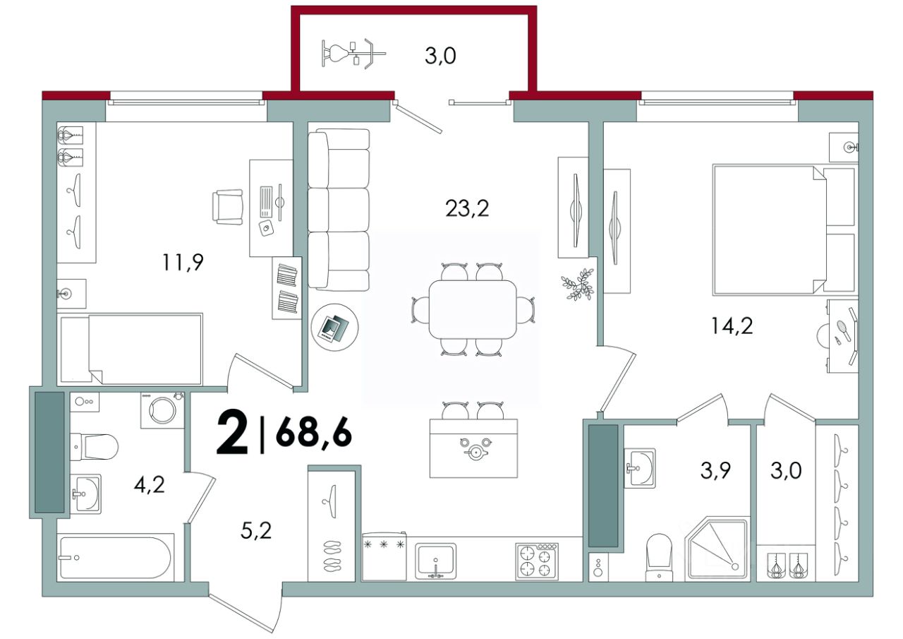 Общая площадь68,6 м²