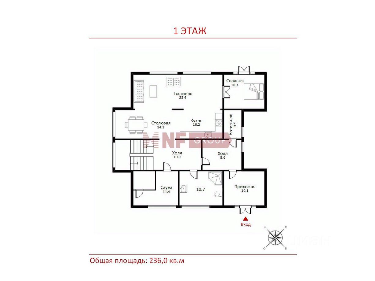 - Планировка включает в себя просторные и функциональные помещения: прихожую-гардеробную, холл, котельную, санузел, сауну, кухню-столовую, гостиную, гостевую и детские спальни, мастер-спальню с собственным санузлом и гардеробной.