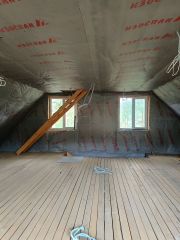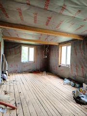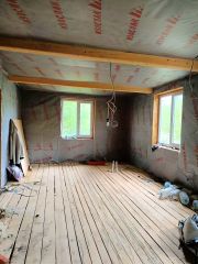 Стены, полы, крыша утеплены. Выполнена разводка электричества, канализации.