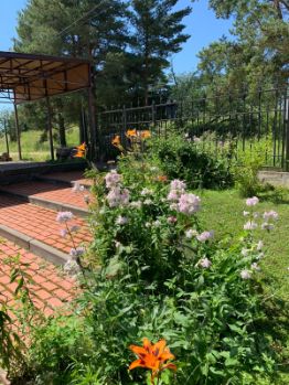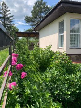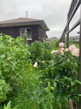 На участке множество садовых растений и цветовПлодовых кустарников и деревьев