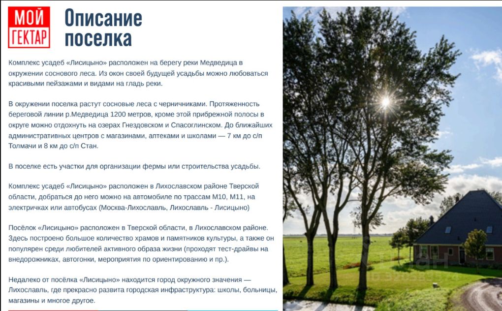 Комплекс усадеб Лисицино расположен на берегу реки Медведица в окружении соснового леса. Из окон своей будущей усадьбы можно любоваться красивыми пейзажами и видами на гладь реки.