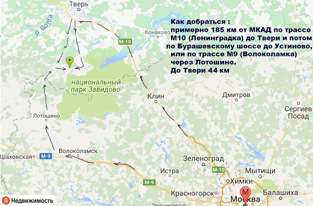 - 185 км от МКАД по М10 (Ленинградка) до Твери и потом по Бурашевскому или Тургиновскому шоссе до д.Устиново или по М9 (Волоколамка) через г. Лотошино.
