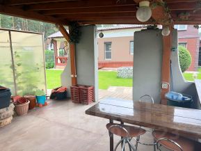 В уютном пространстве, обнесенном забором из профлиста и оборудованном автоматическими воротами Вы найдете парковку для 3-4 авто, большую терассу ок 30 кв м с возможностью помыть посуду, приготовить шашлык или барбекью и много приятных дизайнерских решений в виде мозаичного панно, горшочков для цветов, уличных фонарей и окультуренных технических сооружений.