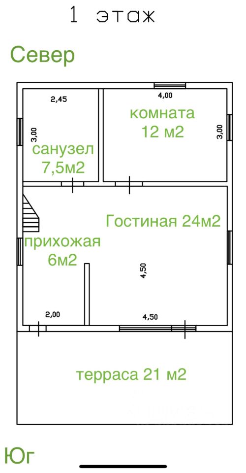 - 1 этаж: прихожая, просторная кухня-гостиная с панорамным остеклением и выходом на открытую террасу, спальня, ванная комната с санузлом.