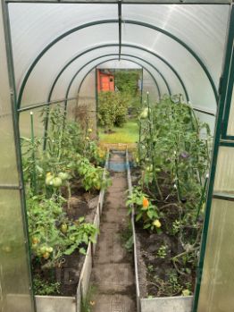 Растет много цветов, плодовых и ягодных деревьев и кустарников ( яблони, клубника, малина, смородина).