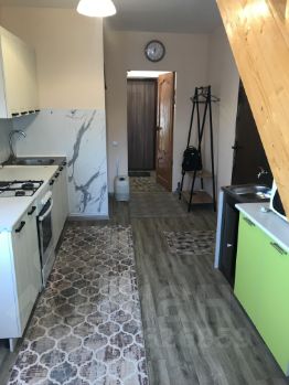 Кухня: Новая кухня. Под кухонной мойкой проточный водонагреватель. Металлический умывальник с подогревом. Холодильник. Микроволновка.