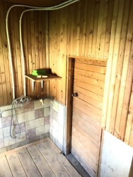 Баня 18,4 м² (с парилкой и душем), кирпичный хозблок 18,4 м² (бывший гараж), дровяник. В хозблоке электрическая плита. Уличный новый туалет. Коммуникации: Электричество, летний водопровод, колодец (21 кольцо), септик 2 кольца. Газ по границе участка (соседи уже подключились). Расположение: Тихий зеленый район у леса, рядом пруд .