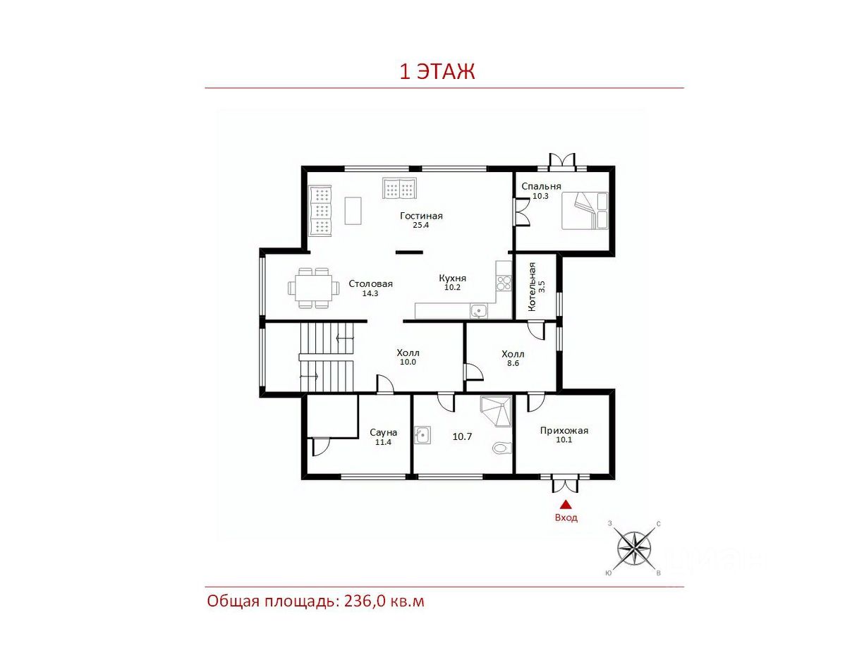 1 этаж: прихожая-гардеробная, холл, котельная, холл, с/у, сауна, кухня-столовая, гостиная, гостевая спальня;