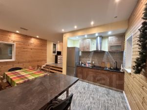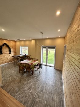 Первый этаж: кухня - столовая с панорамными окнами и выходом на участок, просторная гостиная с действующим камином (ручная работа), с/у, техническое помещение с установленным оборудованием.