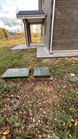 Сделана отмостка и водосточная система, смонтирована ливнёвка.