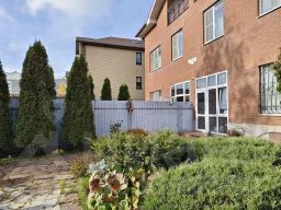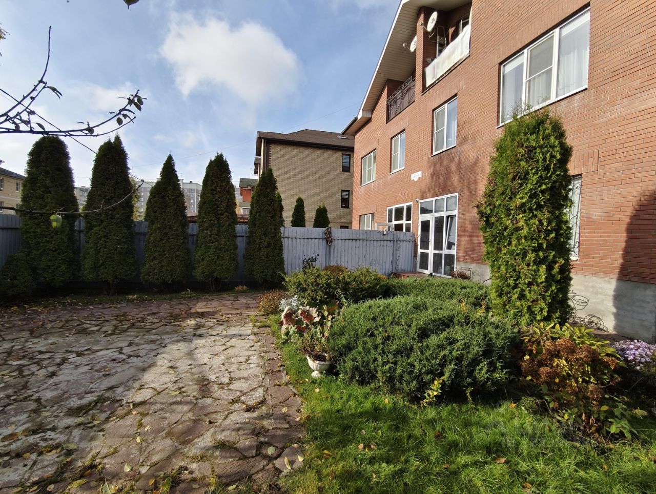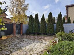На участке растут красивые туи, черешня, декоративные цветы.
