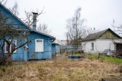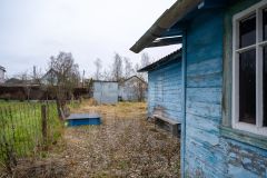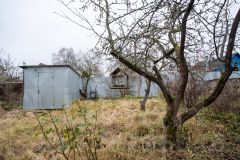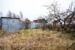 На участке — плодовые деревья, добавляющие шарма и свежести, а также помещение для бытовых нужд, идеальное для инструментов или садового инвентаря.