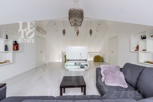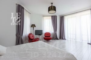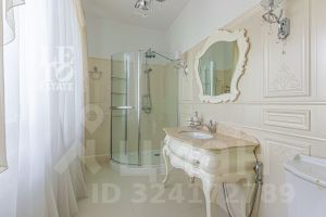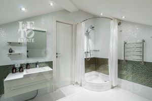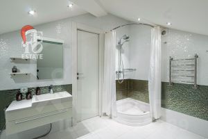 Основной дом (568.4 кв.м.) — это просторное и светлое родовое гнездо для большой семьи. Он выполнен из кирпича в классическом стиле с панорамным остеклением, наполняющим интерьеры светом, и оформлен в элегантной светлой палитре. Ключевые фишки: второй свет в гостиной, создающий ощущение простора, теплые полы для комфорта в любое время года. Сюда заведены все коммуникации (газ, электричество, септик, скважина), что гарантирует автономность и отсутствие хлопот.