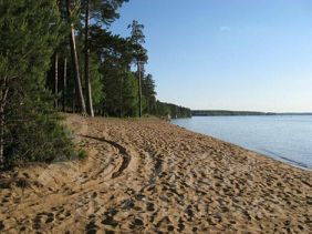 Пляжная зона с деревянной набережной, спуском в воду, водной горкой, прокатом лодок и ватрушек.
