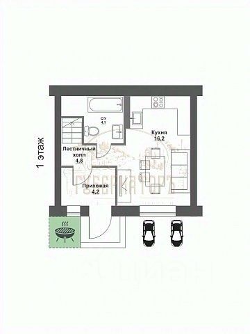 1 этаж: Прихожая (4,5 м), уютный холл (4,8 м), с/у (4,1 м) и сердце дома светлая кухня - гостиная 16,2 м с выходом во двор!