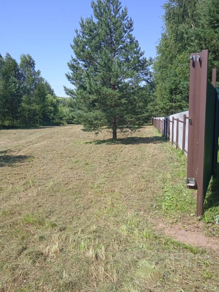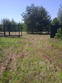 На участке и за территорией сосны. Территория огорожена с одной стороны забором высотой 2 метра из профнастила (глухой), с других сторон металлический каркас, одни ворота раздвижные - на дорогу, вторые - распашные - на пляж и реку.