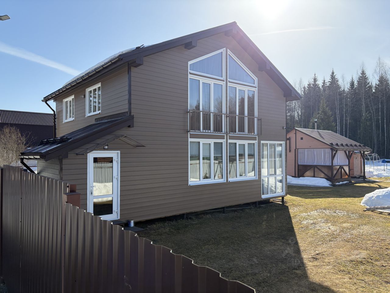 Продается каркасный отлично утеплённый дом два этажа с панорамными окнами впол, общая площадь 128,6 кв.м. Дом оформлен как жилой - можно прописаться, по документам 33.3 кв.м. (разрешение на реконструкцию есть, можно узаконить реконструкцию). Площадь участка 12 соток. Участок огорожен по периметру забором, свой выход в расчищенный лес.
