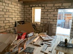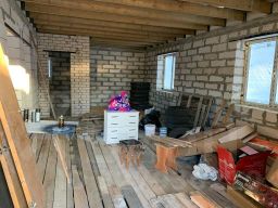 Материал дома пеноблоки, кирпич. Ленточный фундамент. Сделана крыша.